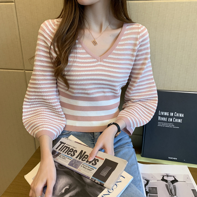 灯笼袖针织打底衫条纹V领小衫 [交易快照] 颜色分类:粉色尺码:均码