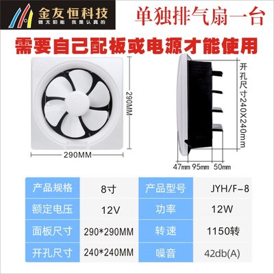 太阳能排气扇静音方孔排风扇厨房窗户12V抽风扇直流家用通风换气:白色8寸排气扇