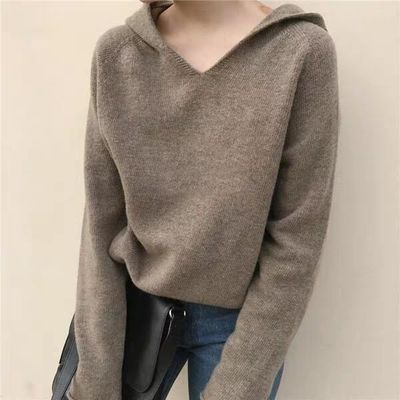 春秋超火cec长袖打底卫衣女潮v领慵懒风连帽针织衫帽衫女薄款宽松