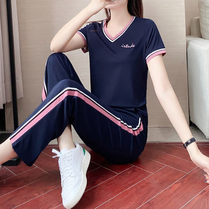 2021名牌短袖长裤运动服套装女夏季冰丝休闲时尚套装宽松两件套潮