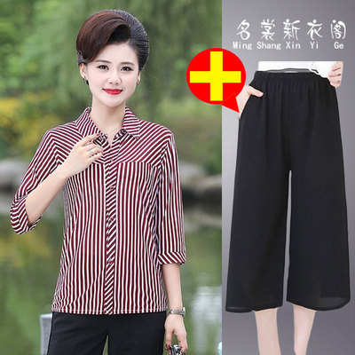 夏季妈妈条纹衬衫中袖薄款大码弹力40-50岁衬衣中老年外套打底衫