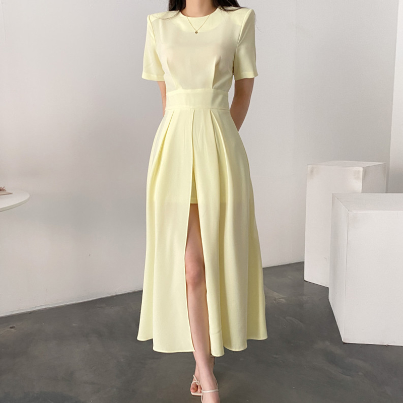 韩国chic夏季轻熟风圆领高腰显瘦设计感过膝长款开叉连衣裙裤裙女