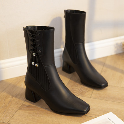2020秋冬新款方头高跟粗跟短靴女弹力显瘦瘦靴英伦毛线中筒靴ins