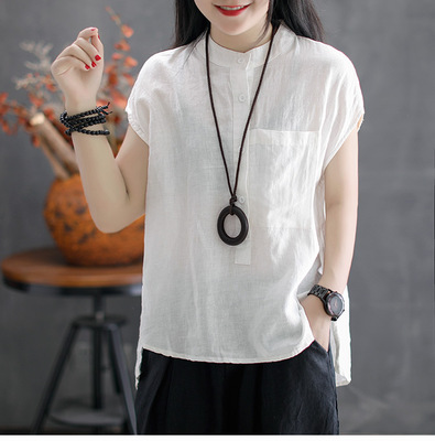 文艺复古亚麻衬衫女夏宽松棉麻无袖寸衫立领套头休闲衬衣纯色上衣