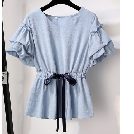 夏装2020新款衬衣大码女装裙摆小衫胖妹妹收腰雪纺上衣设计感洋气