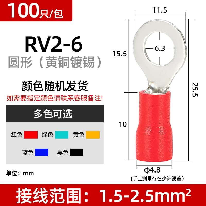 冷压接线端子欧式RV1.25-3.2圆型2/3.5/5.5/4/5/6/8S预绝缘铜鼻子
