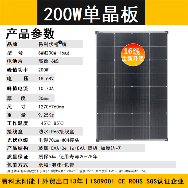易科16线200w太阳能板单晶12V光伏发电板家用系统充电板房车家用