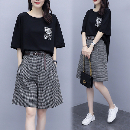 刺绣格子遮肚显瘦亚麻阔腿两件套 [交易快照] 颜色分类:黑色套装送皮带尺码:2XL(建议150-170斤