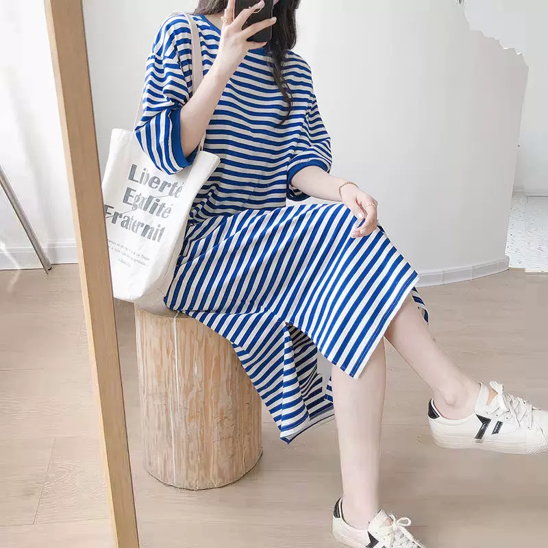【国庆价】夏季ins韩版设计感蓝色条纹连衣裙遮肚大码女装过膝长裙短袖T恤裙 [交易快照] 颜色分类:黑条纹2XL