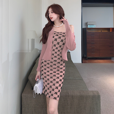 港风时尚套装两件套女春季新款洋气开衫外套针织吊带包臀连衣短裙 [交易快照] 颜色分类:粉红色尺码:S